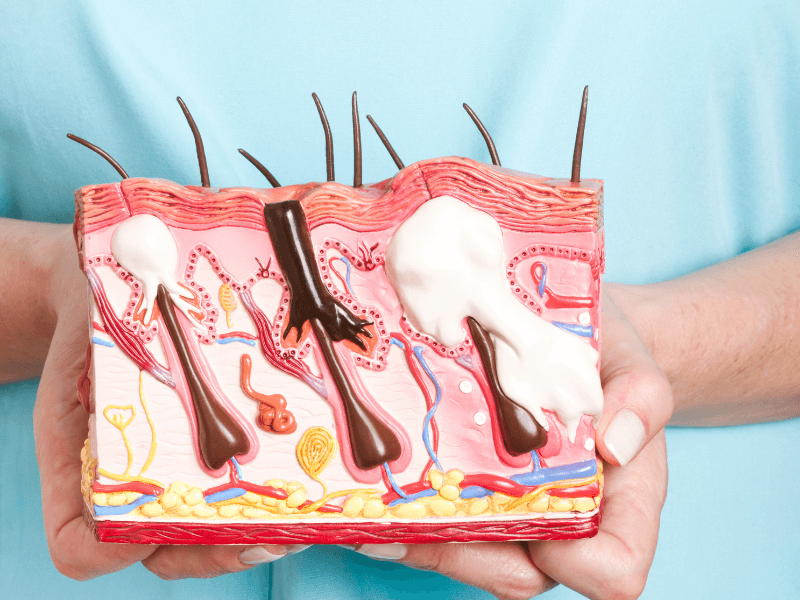 Mụn được hình thành khi lỗ chân lông của bạn bị tắc nghẽn. Mỗi nang lông chứa một sợi tóc và một tuyến bã nhờn sản xuất dầu. Dầu này được gọi là bã nhờn, giúp giữ cho làn da của bạn mềm mại. Các tế bào da chết và dầu thường tích tụ ở lỗ mở nang da, điều này tạo điều kiện cho môi trương vi khuẩn gây mụn phát triển và hình thành mụn bọc hoặc mụn viêm. Nếu da trên vết sưng vẫn đóng lại, vết sưng được gọi là mụn đầu trắng. Khi da trên vết sưng mở ra, tiếp xúc với không khí khiến nó có màu đen và hình thành mụn đầu đen.