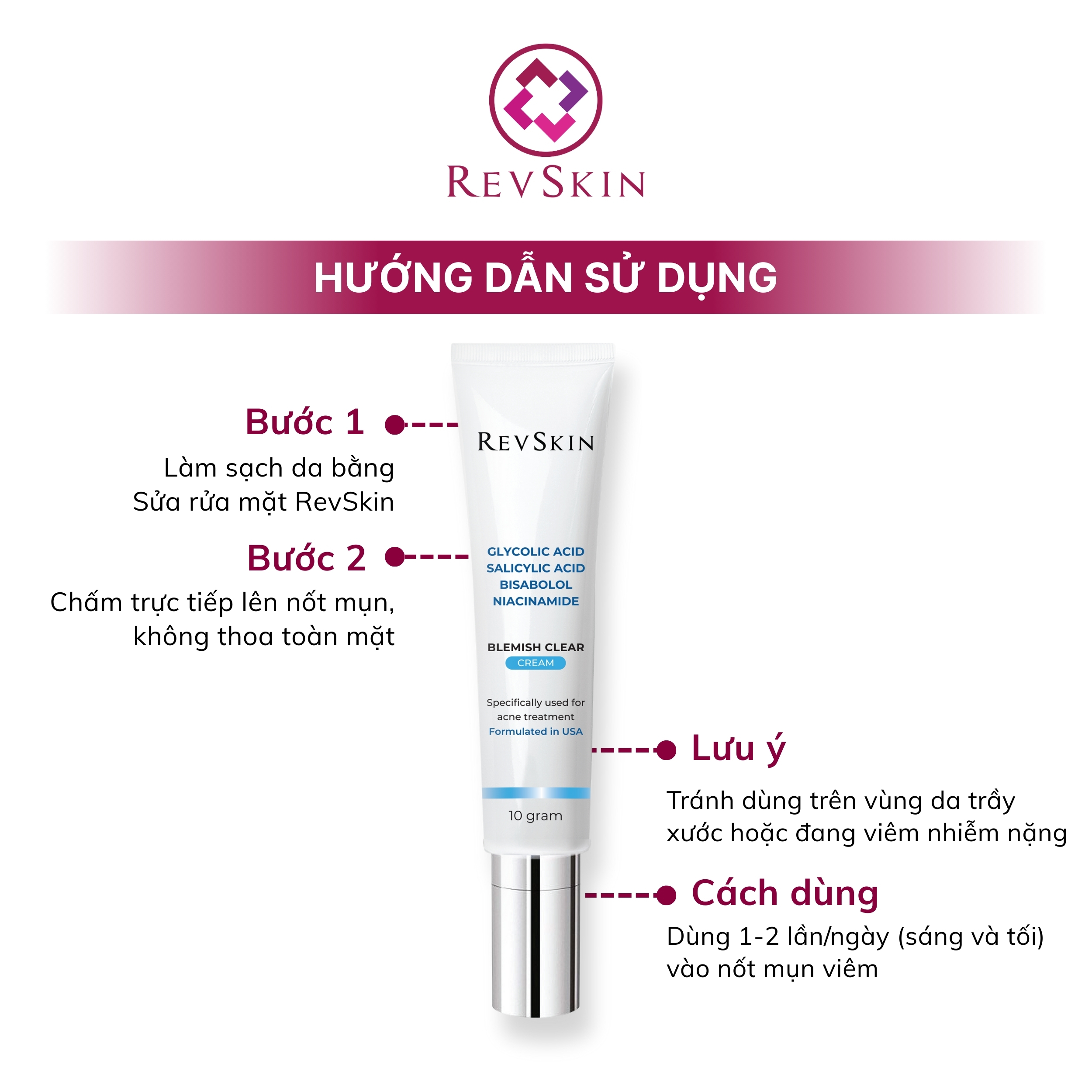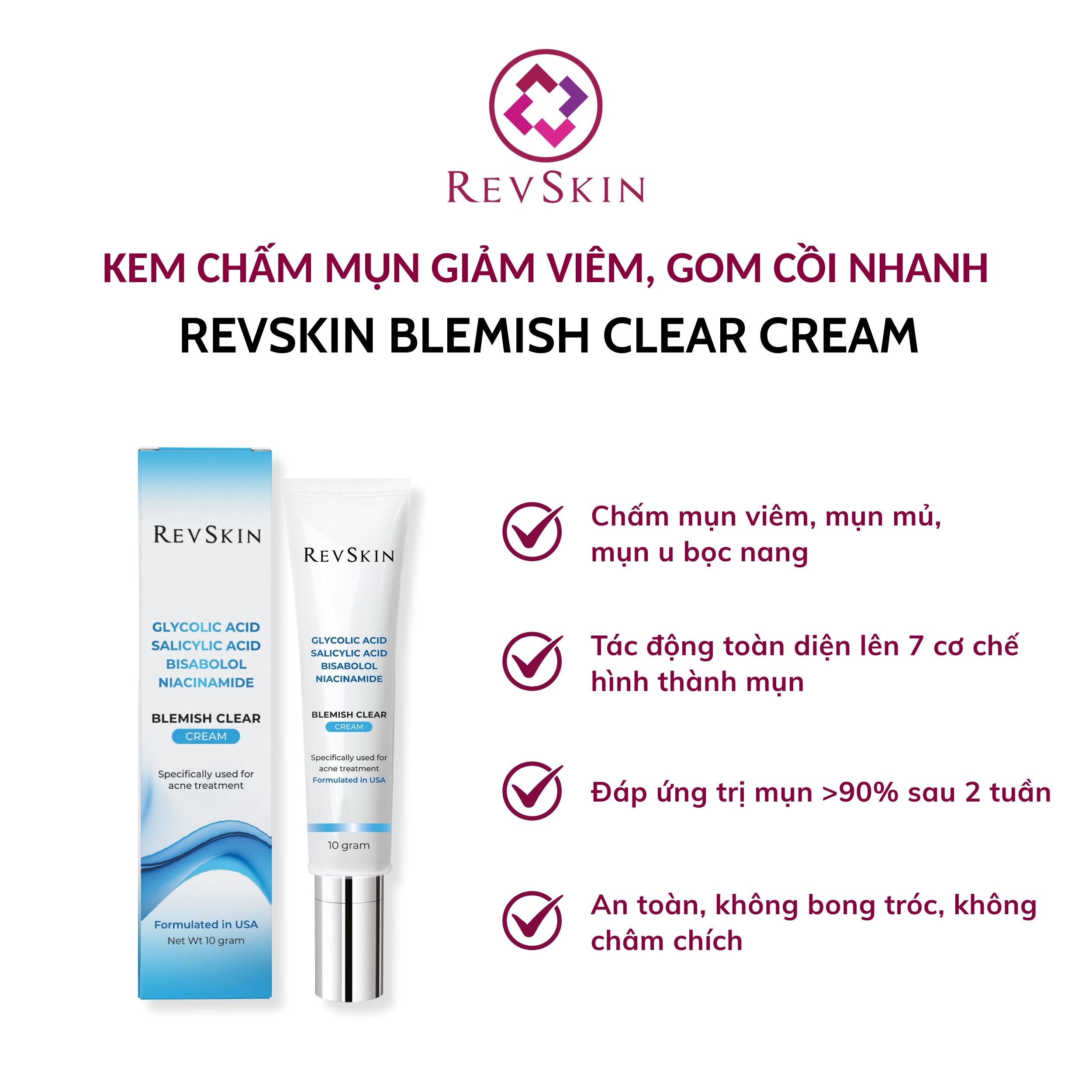 Sản phẩm Revskin Blemish Clear Cream được thiết kế dành riêng cho mụn viêm, mụn mủ và ngừa thâm mụn, mang lại kết quả lâm sàng rõ rệt chỉ sau 2-4 tuần sử dụng: